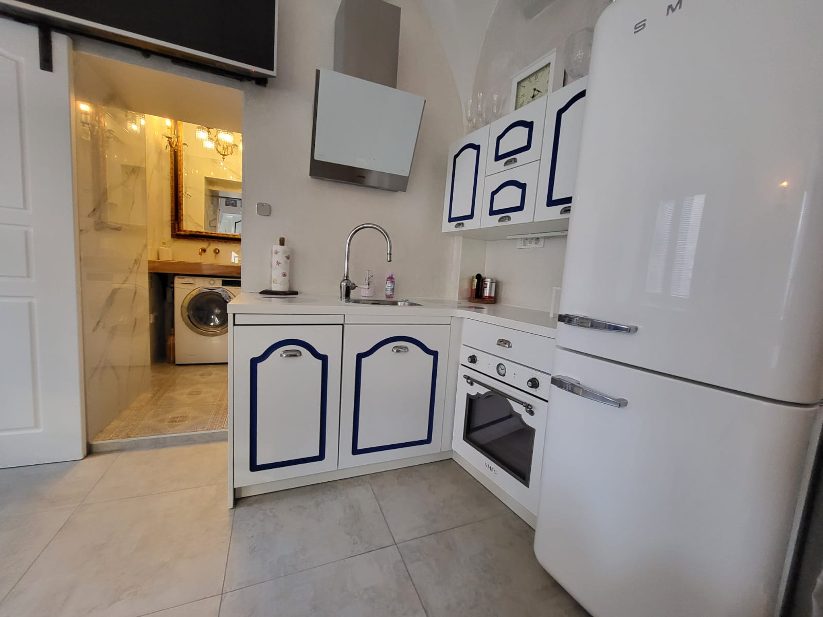 The kitchen is fully equipped with new, high-end appliances, including a large SMEG refrigerator, SMEG oven, microwave, dishwasher, washer-dryer, coffee machine, and more.